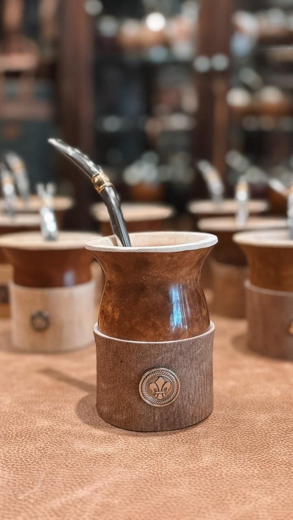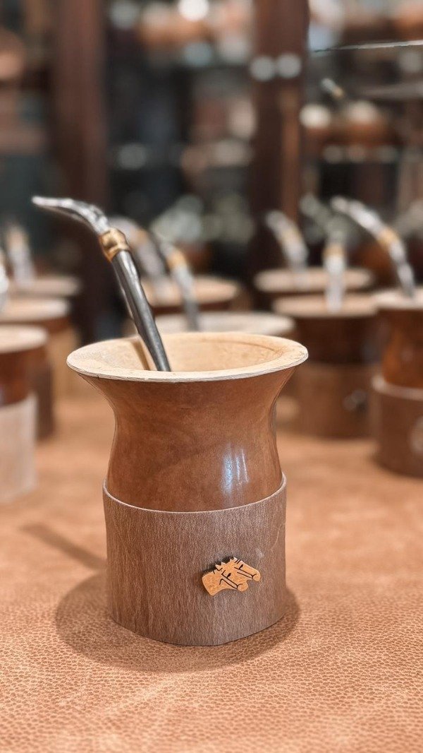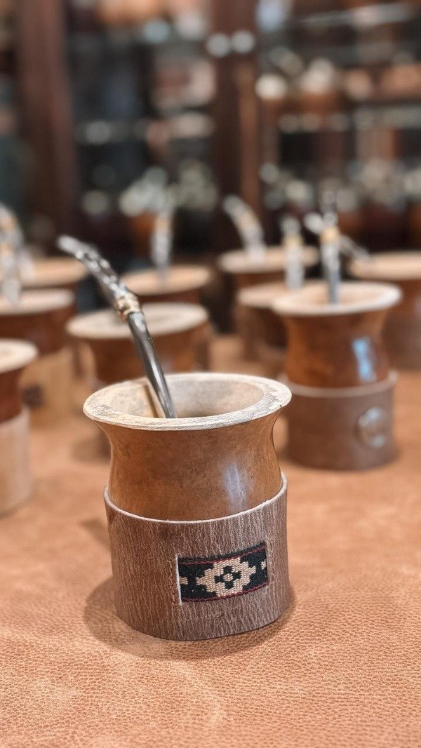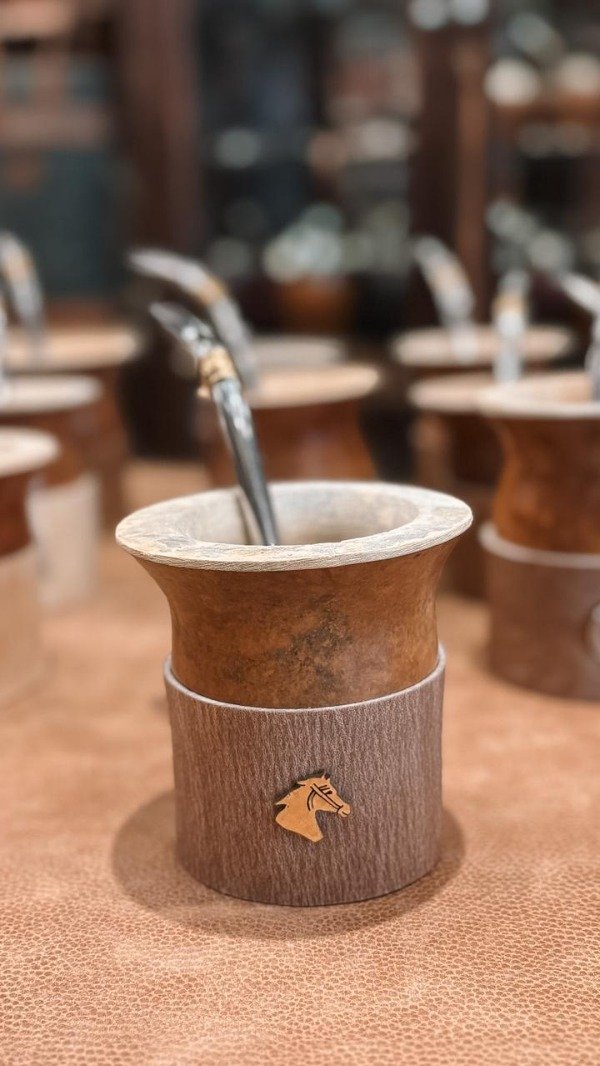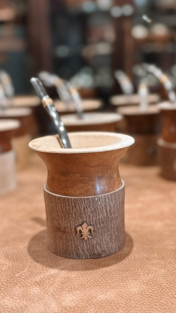 Mate artesanal elaborado en calabaza natural pulida,con basa en cuero crudo,con apliques y guardas pampas,brindando mayor estabilidad, resistencia y protección al apoyar el mate.
