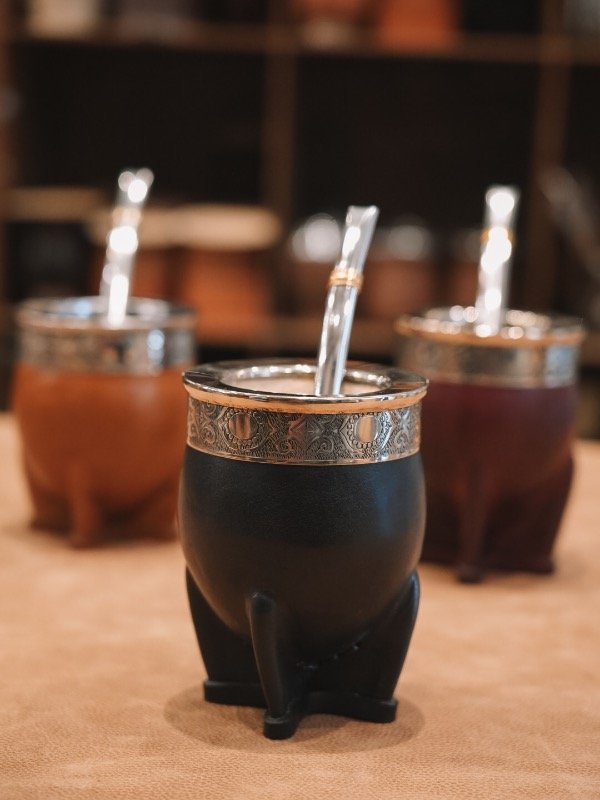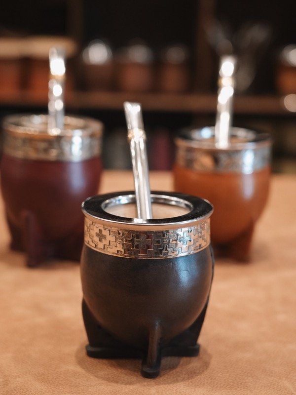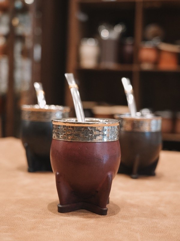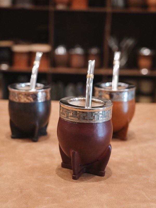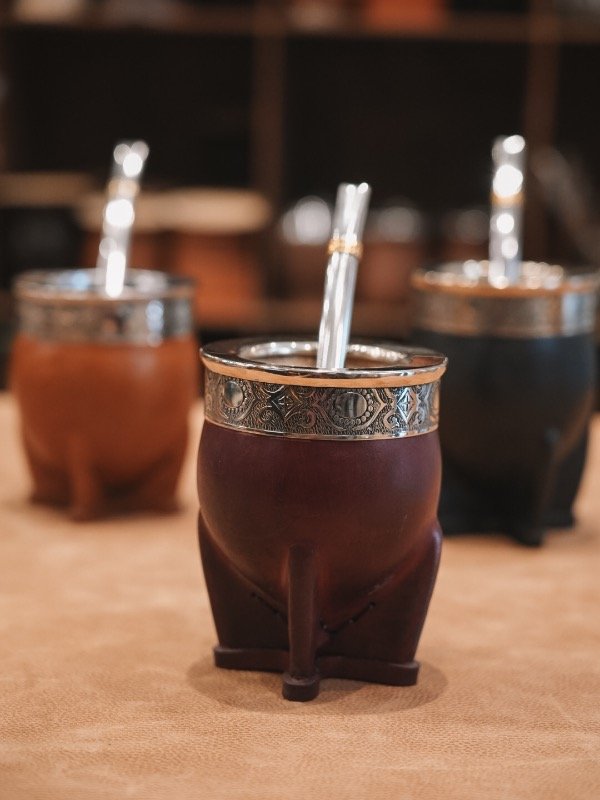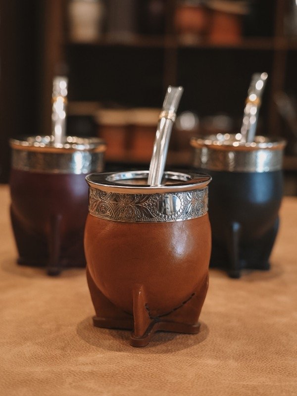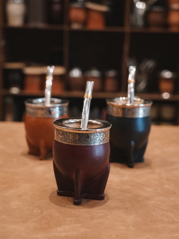 Mate imperial artesanal, elaborado en calabaza natural y forrado a mano en cuero de alta calidad.