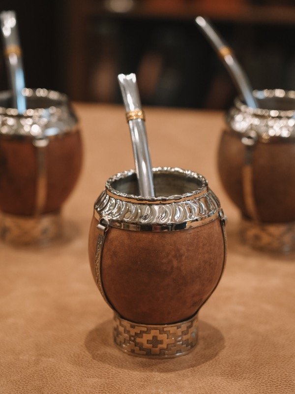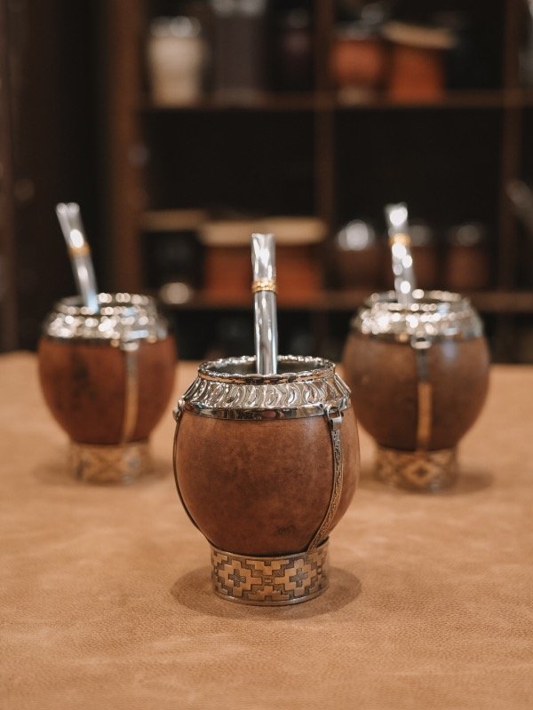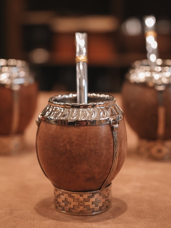 Los detalles en alpaca realzan la estética del mate y refuerzan su estructura, logrando una pieza distinguida y única. Al tratarse de un producto artesanal, cada mate presenta variaciones propias de los materiales naturales.