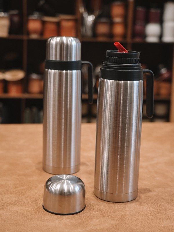 Termo de 1L, de acero inoxidable, diseñado para conservar la temperatura de bebidas calientes o frías por varias horas. Cuenta con pico cebador de apertura práctica, ideal para cebar mate con comodidad y precisión, y manija lateral que facilita el agarre.